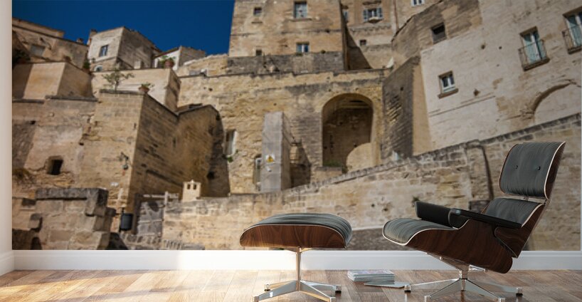 Visitors walk through the ancient alleys of Matera. Historic buildings rise above stone steps. Bright sky adds to the scenery.