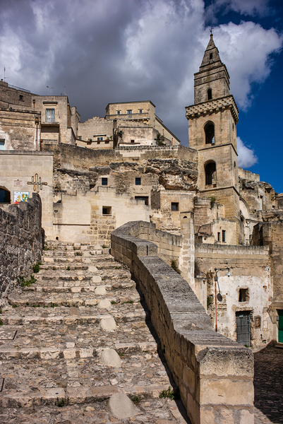 Visitors walk up the stone steps in Matera Italy. The Church of Saint Peter Barisano stands tall among the ancient buildings under a cloudy sky.