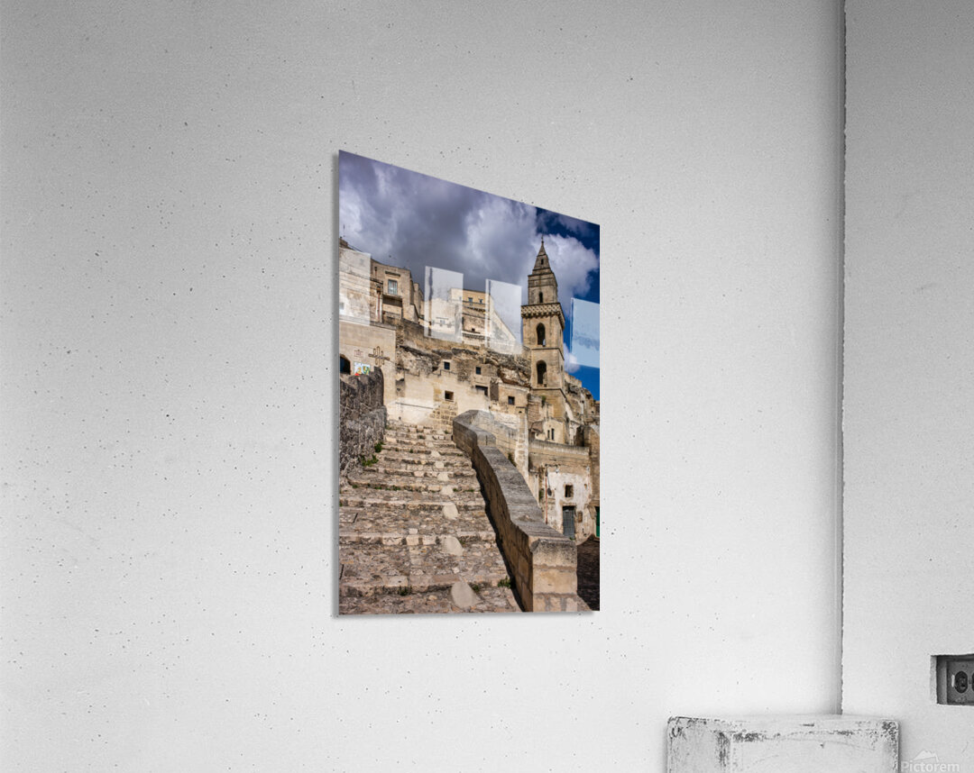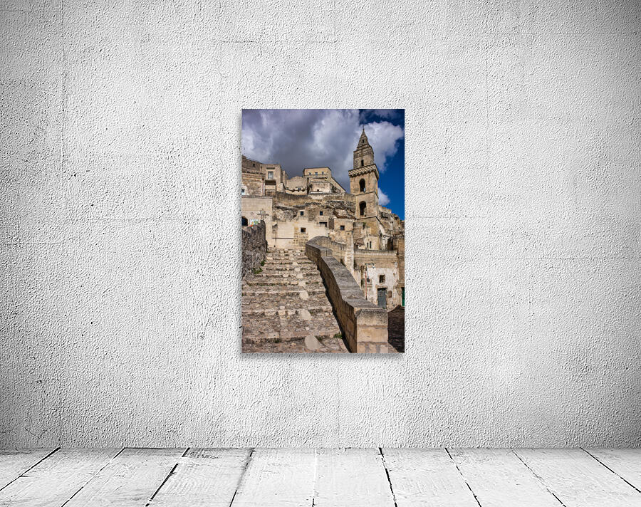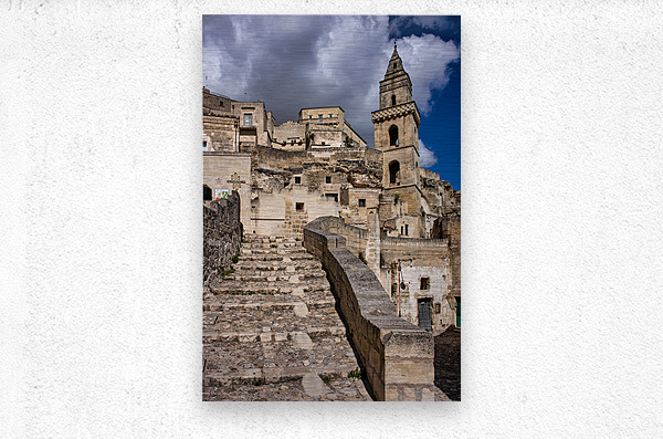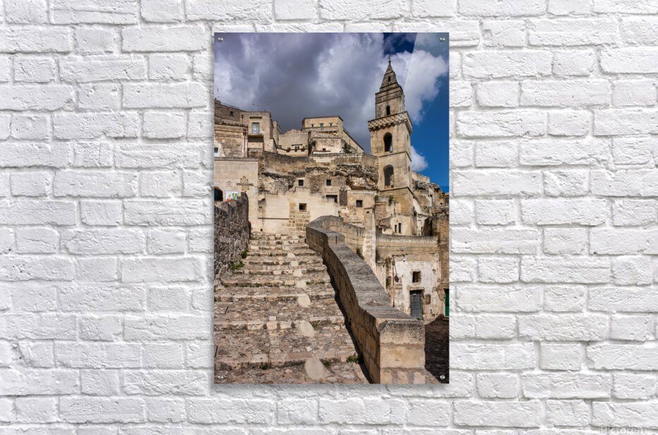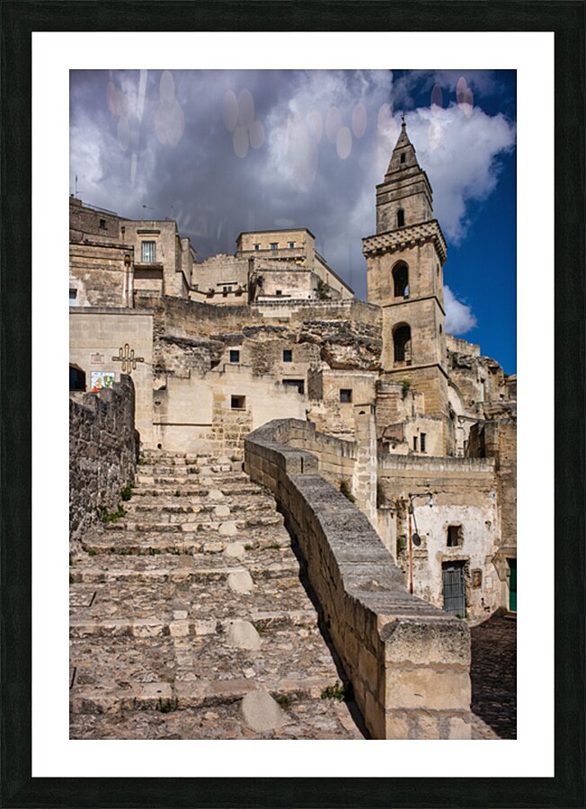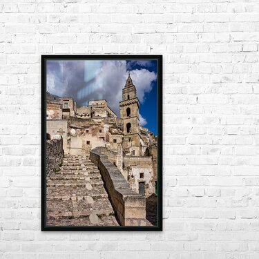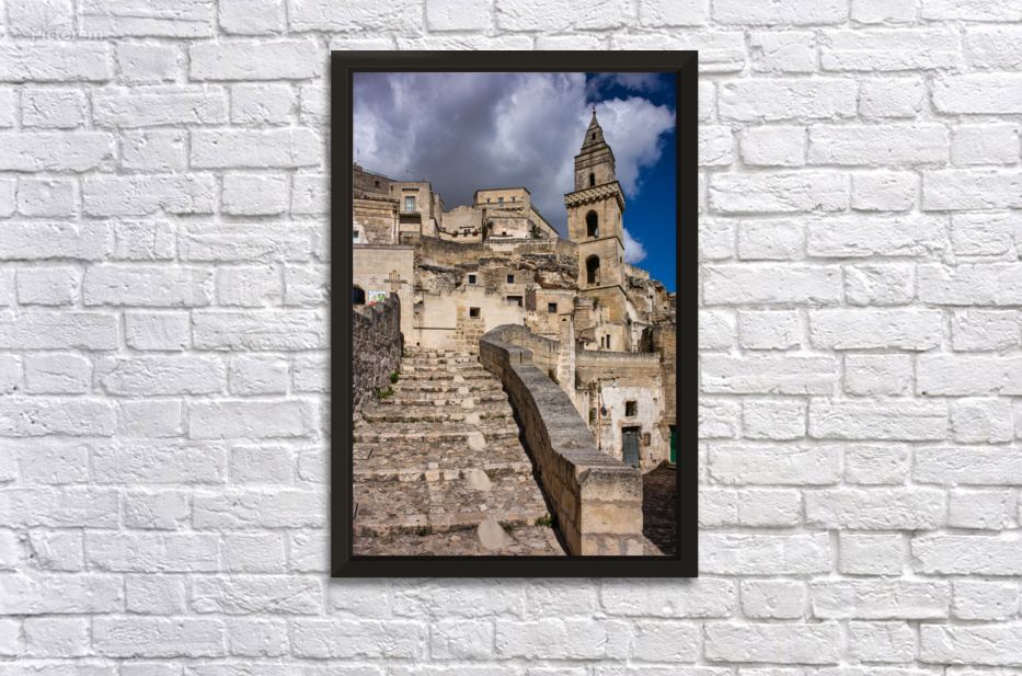 "Visitors walk up the stone steps in Matera Italy" in a framed print.