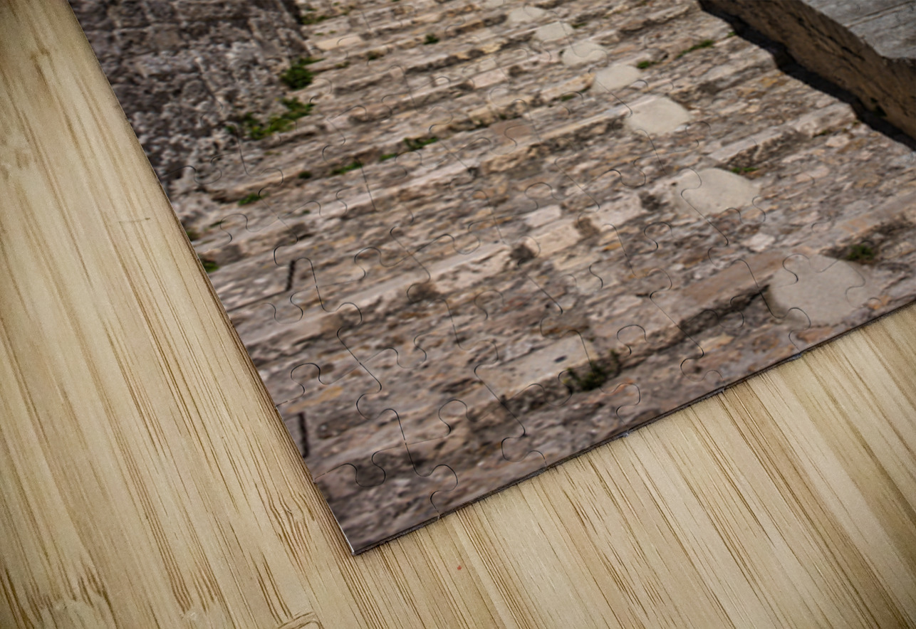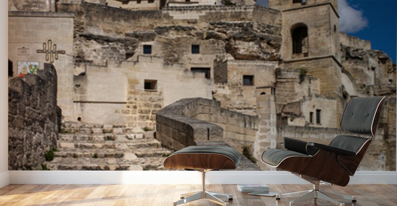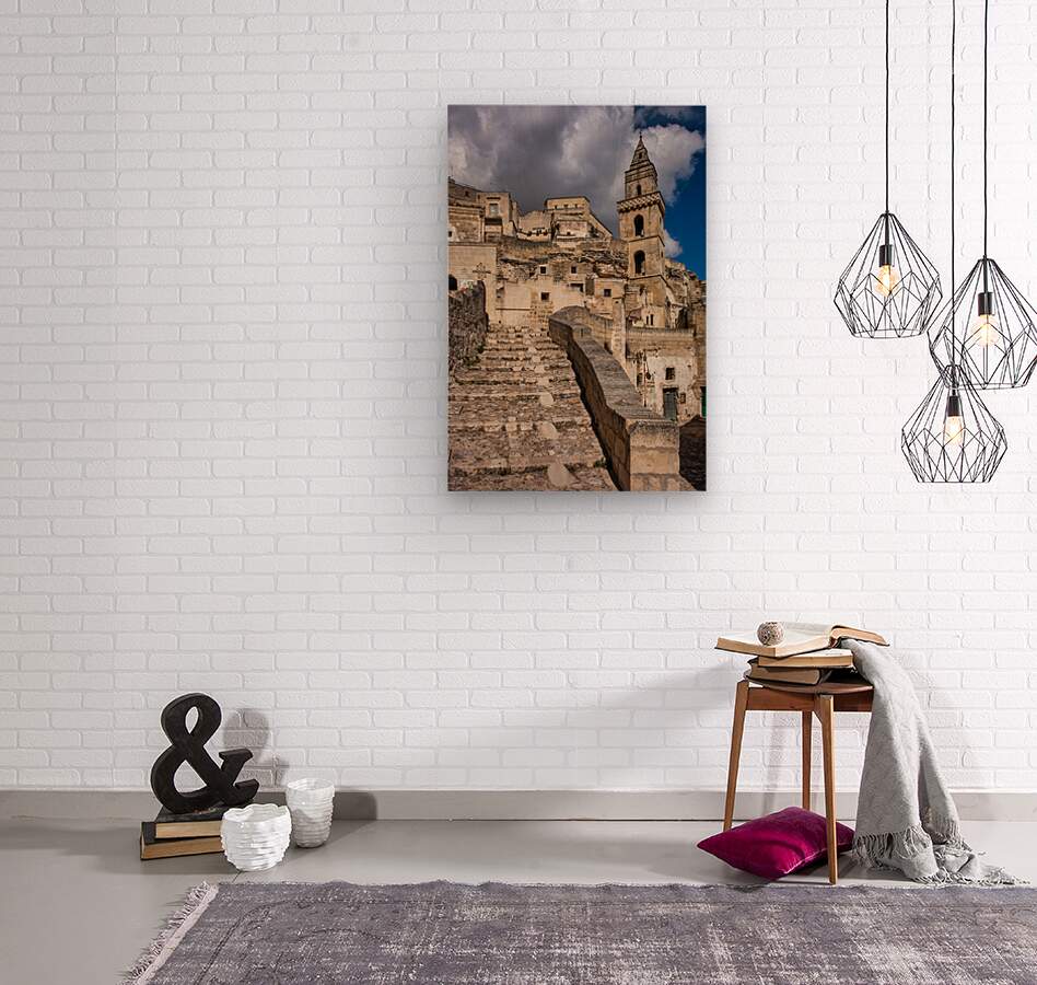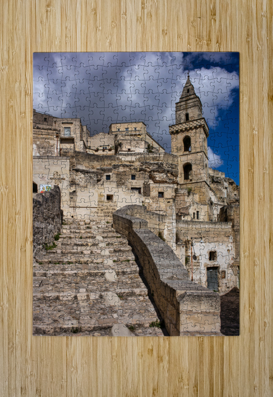 "Visitors walk up the stone steps in Matera Italy" in a framed print.