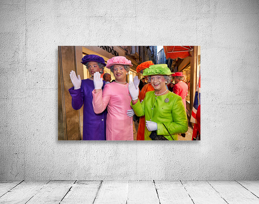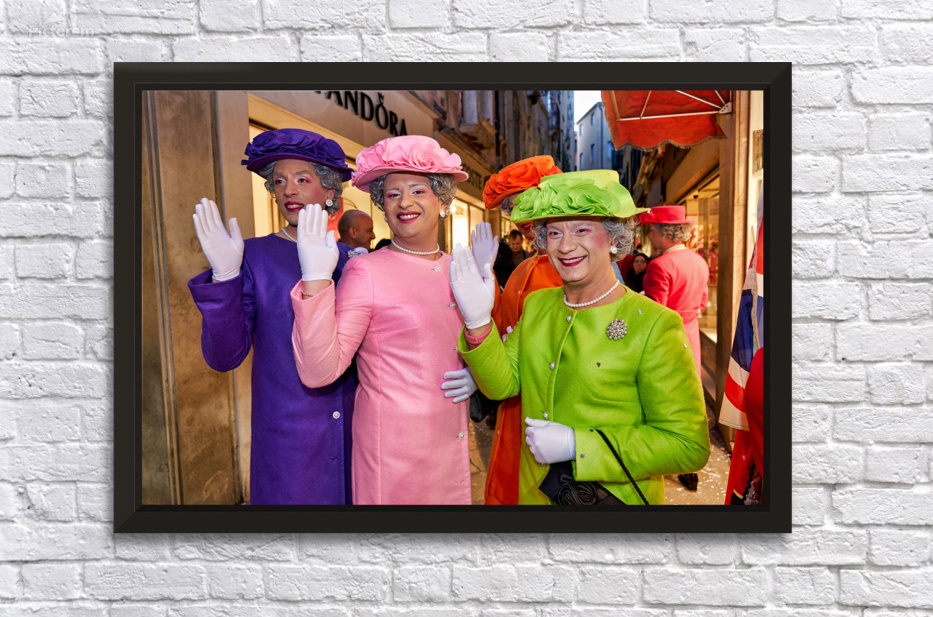 Four people in colorful costumes wave at onlookers on the streets of Venice during the Carnival event which attracts many visitors.