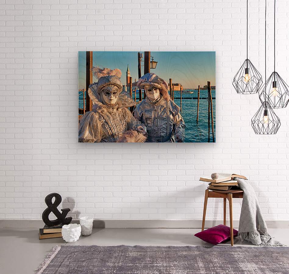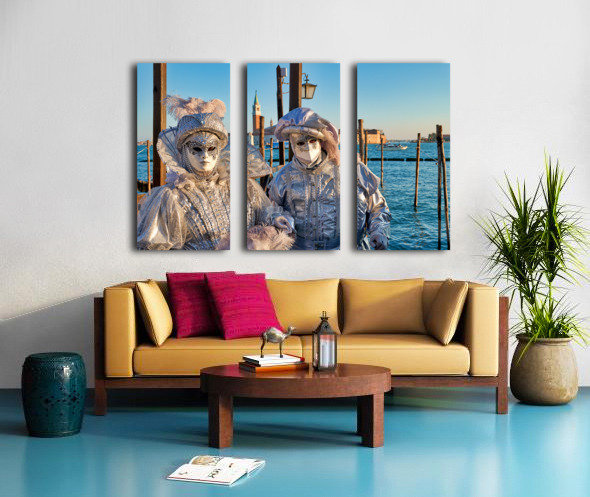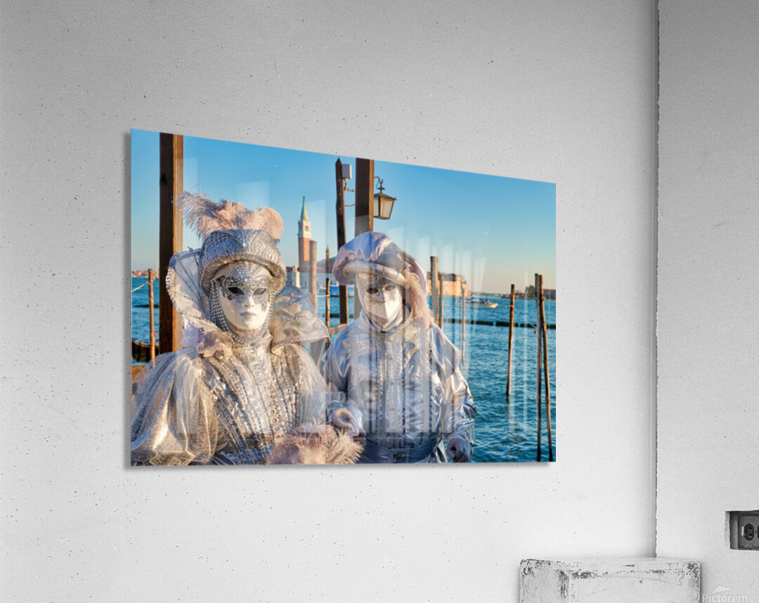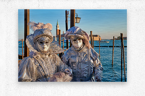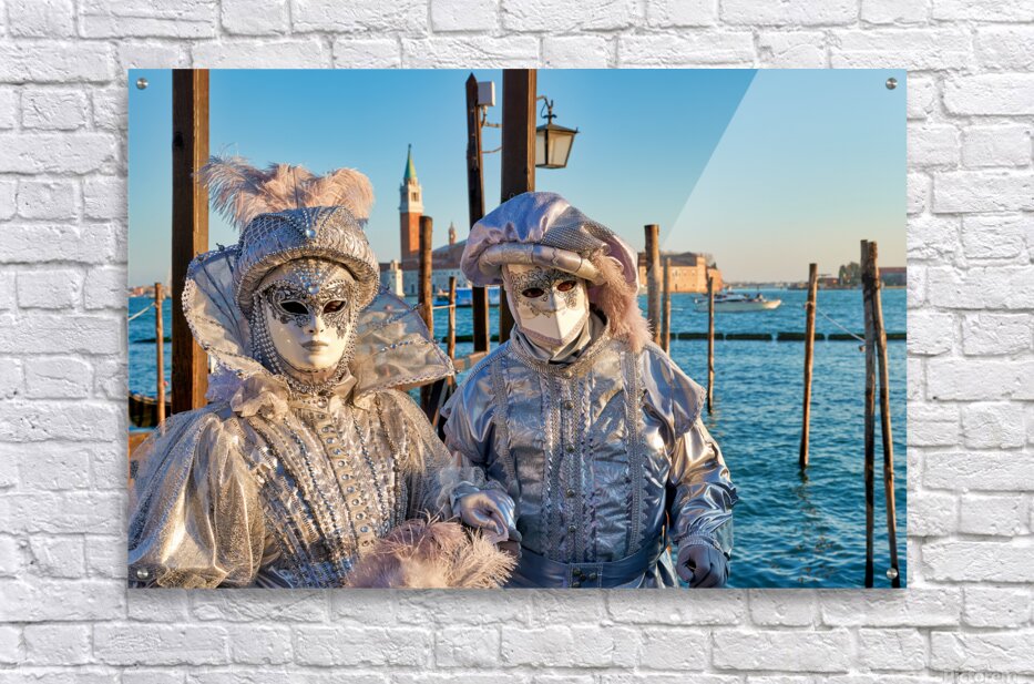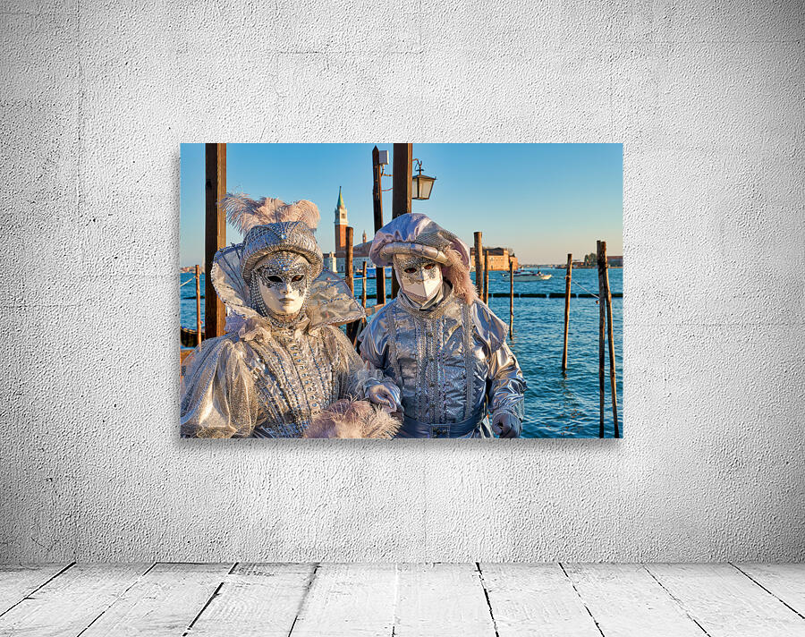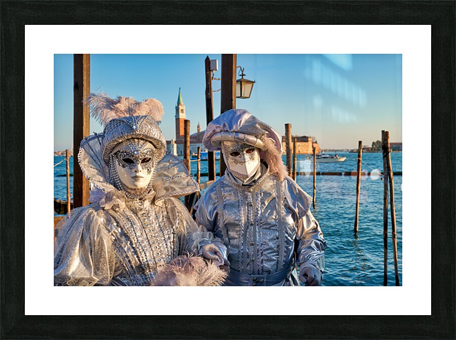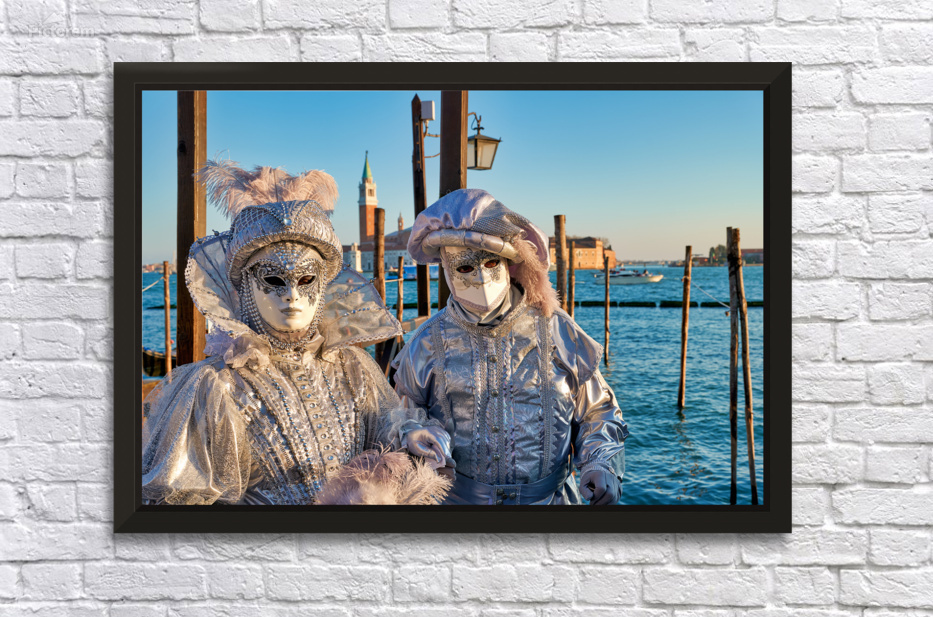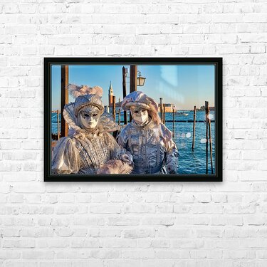 "Venice Carnival with silver costumes near water" in a framed print.