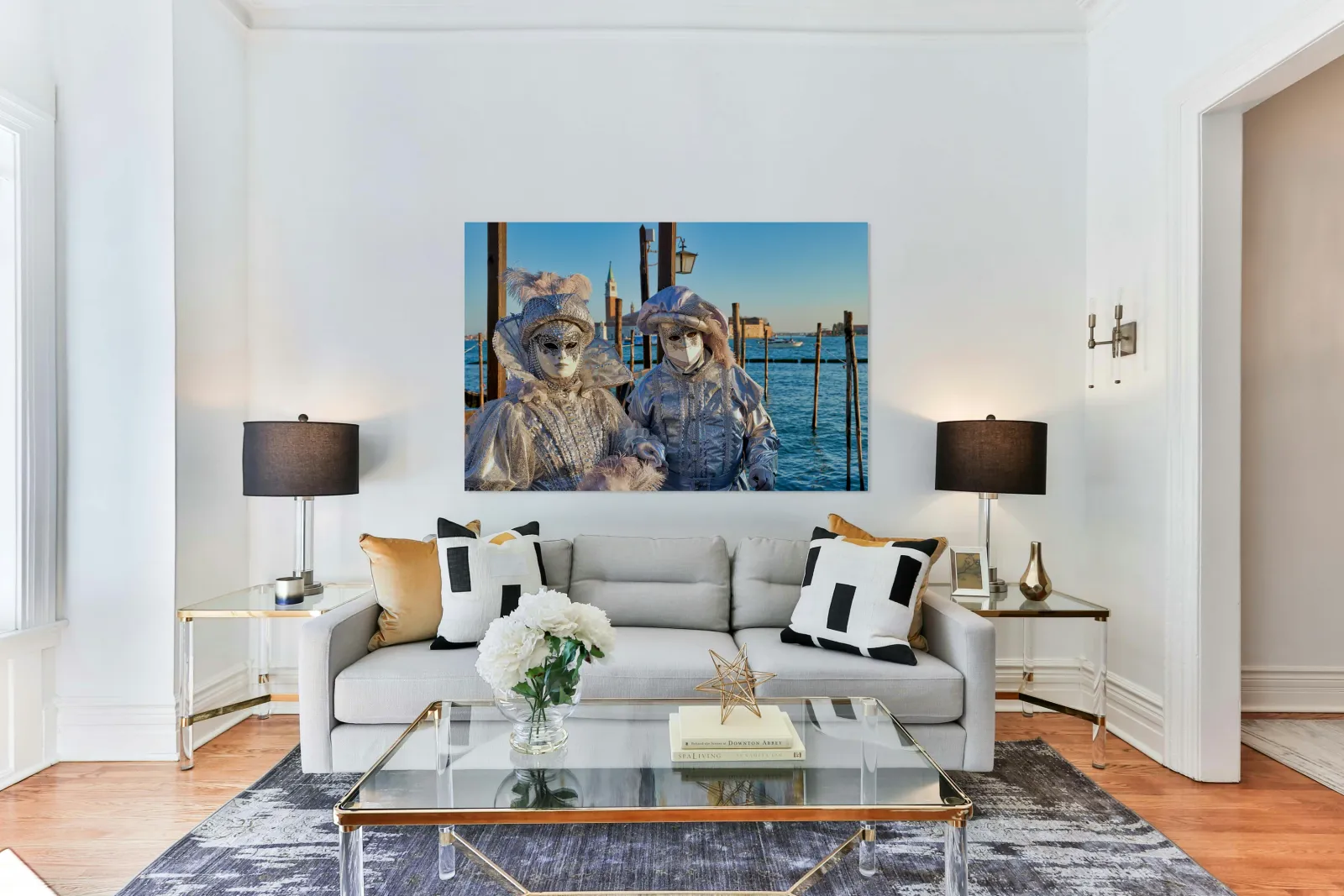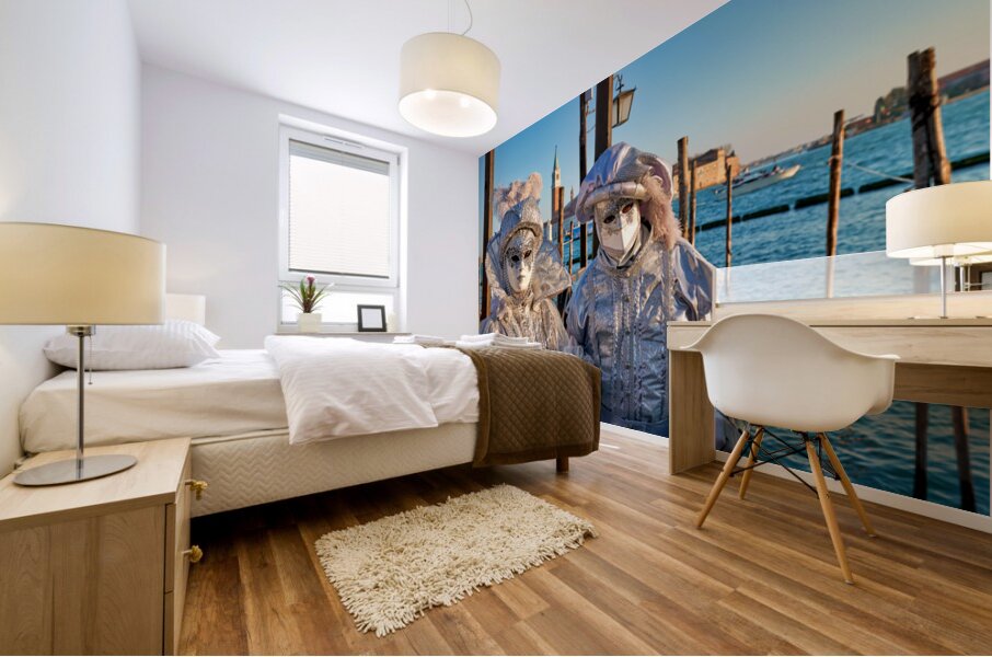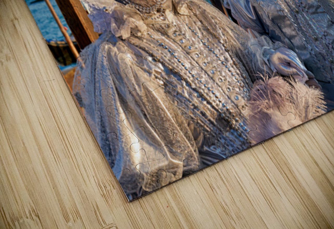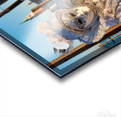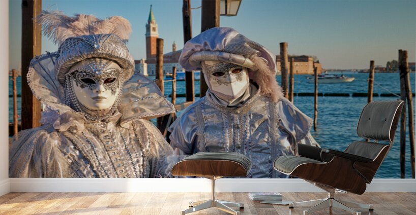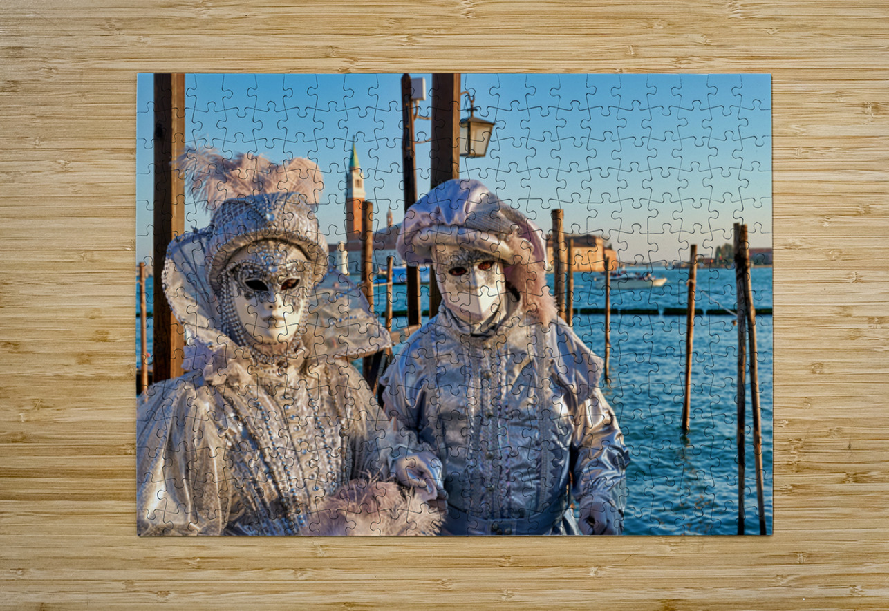 "Venice Carnival with silver costumes near water" in a framed print.