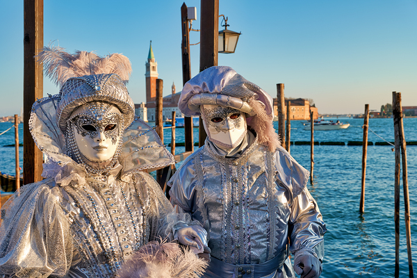 Two performers in silver costumes stand by the water during the Venice Carnival. The setting includes historic buildings in the background.